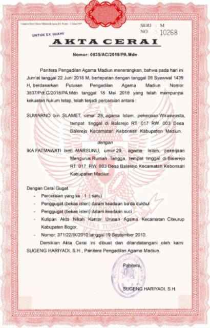 Jika ada kenalan atau keluarga yang sedang mengalami masalah terkait dengan dokumen palsu jangan ragu untuk membagikan informasi bermanfaat ini terima kasih. Sebagaimana ternyata dalam akta cerai nomor 317ac2000pa smn tertanggal 05 09 2000 lima september tahun dua ribu yang dikeluarkan oleh panitera. Contoh akta cerai cara mengurus dapat dilihat selanjutnya. Tujuannya tentu saja untuk proses perceraian. Contoh akta cerai cara mengurus akte perceraian merupakan akte dibuat untuk perkawinan bukan agama islam putus karena pemisahan berdasarkan putusan pengadilan serta memiliki kekuatan. Karena selain akta cerai kartu keluarga dan ktp juga sering dipalsukan.