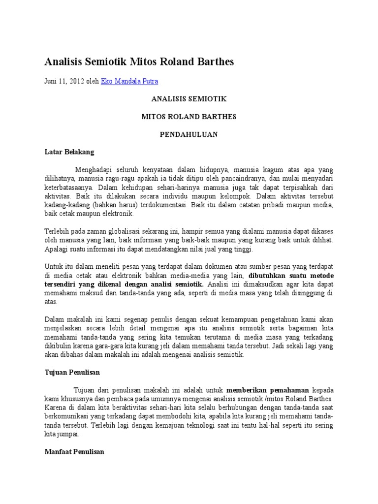 Contoh analisis semiotika roland barthes. Analisis semiotika roland barthes tentang fenomena jilboobs article pdf available in jurnal studia insania 42117 october 2016 with 15457 reads how we measure reads. Skripai dengan judul analisis semiotika terhadap iklan susu bendera edisi ramadhan di televisi merupakan karya yang memiliki banyak tantangan dalam proses penyelesainnya. Barthes berpendapat bahasa adalah sebuah sistem tanda yang mencerminkan asumsi asumsi dari suatu masyarakat tertentu dalam waktu tertentu. Dalam penilaian john lechte 2001 buku yang berjudul sarrasine ditulis barthes sebagai upaya untuk mengeksplisit. Kita tidak hanya mengetahui bagaimana isi pesan yang hendak disampaikan melainkan juga bagaimana pesan dibuat simbol simbol apa yang digunakan untuk mewakili pesan pesan melalui film yang disusun pada saat disampaikan kepada khalayak. Sebagai ahli linguistik ferdinand de saussure menerapkan konsep semiotika hanya pada tingkat denotatif.