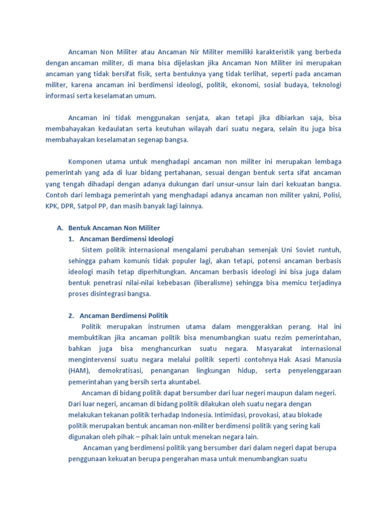 Contoh ancaman berdimensi politik. Ancaman yang berdimensi politik yang bersumber dari dalam negeri dapat berupa penggunaan kekuatan berupa pengerahan massa untuk menumbangkan suatu pemerintahan yang berkuasa atau menggalang kekuatan politik untuk melemahkan kekuasaan pemerintah. Selain itu ancaman separatisme merupakan bentuk lain dari ancaman politik yang timbul di dalam negeri. Dari luar negeri ancaman di bidang politik dilakukan oleh suatu negara dengan melakukan tekanan politik terhadap indonesia. Sebelumnya ketahuilah juga mengenai contoh ancaman non militerberikut ini adalah beberapa contoh ancaman politik yang berasal dari dalam negeri yang bisa anda pahami. Biasanya ancaman bidang politik yang berasal dalam negeri sebagian besar berupa pengerahan massa yang ingin menumbangkan suatu pemerintah yang sedang berkuasa atau juga bisa juga menggalang kekuatan yang berbasis politik untuk melemahkan kekuasaan politik. Yang pertama kita akan membahan mengenai politik yang bisa berasal dari dalam negerti karena ancaman itu asalnya tidak hanya dari luar saja akan tetapi ancaman politik juga dapat datang dari dalam negri.
