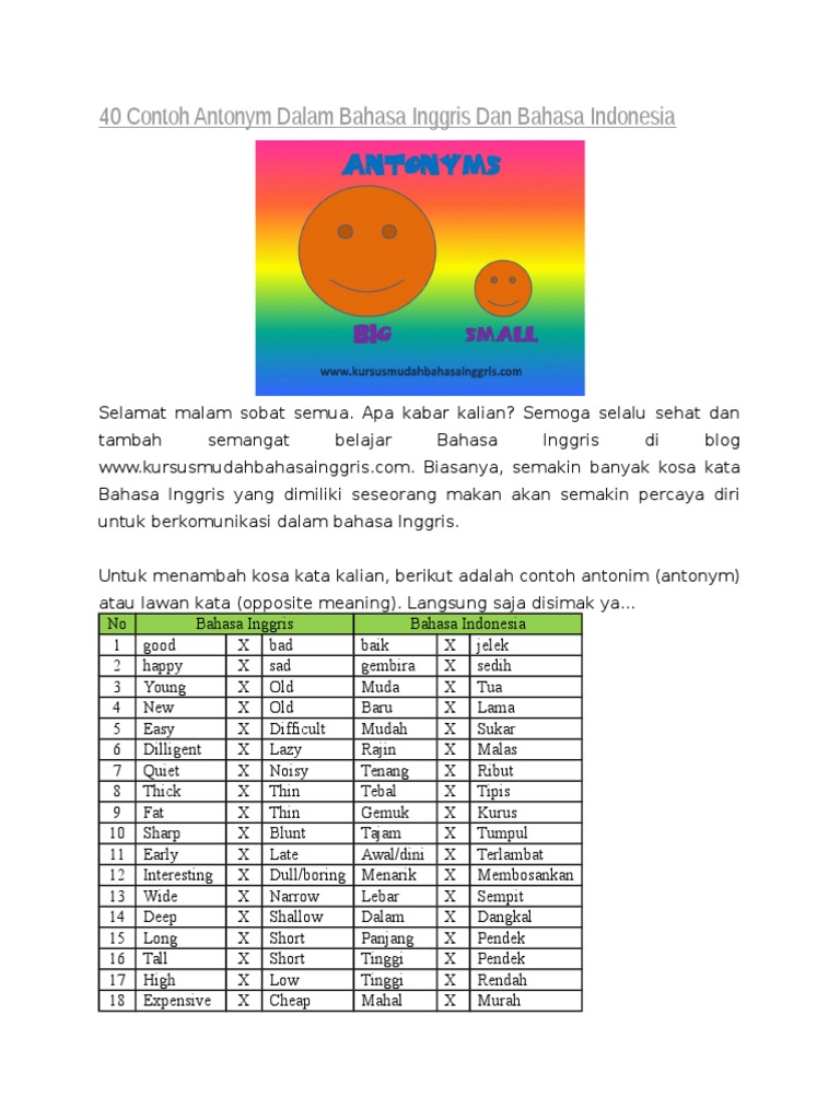 100 sinonim dan antonim dalam bahasa inggris beserta artinya sinonim dan antonim merupakan bagian yang tidak terpisahkan baik dalam bahasa indonesia maupun bahasa inggris. 200 kata antonim dalam bahasa inggris beserta artinya sedikit penjelasan tentang antonim. Dalam kamus besar bahasa indonesia kbbi kata antonim dimaknai sebagai kata yang berlawanan makna dengan kata lain seperti contohnya kata pandai merupakan antonim dari kata bodoh. Synonim antonym dan contoh kalimat hai sahabat sbi kali ini admin akan memberikan lagi kosakata bahasa inggris dalam bentuk tabel beserta arti cara pengucapan sinonim antonim dan contoh kalimatsemoga bermanfaat buat sbi dirumah. Kenalan dengan kosakata bahasa inggris merupakan suatu keharusan bagi ekspresi yang efektif baik di tertulis atau dalam bentuk lisan. Exercise on synonym 1.