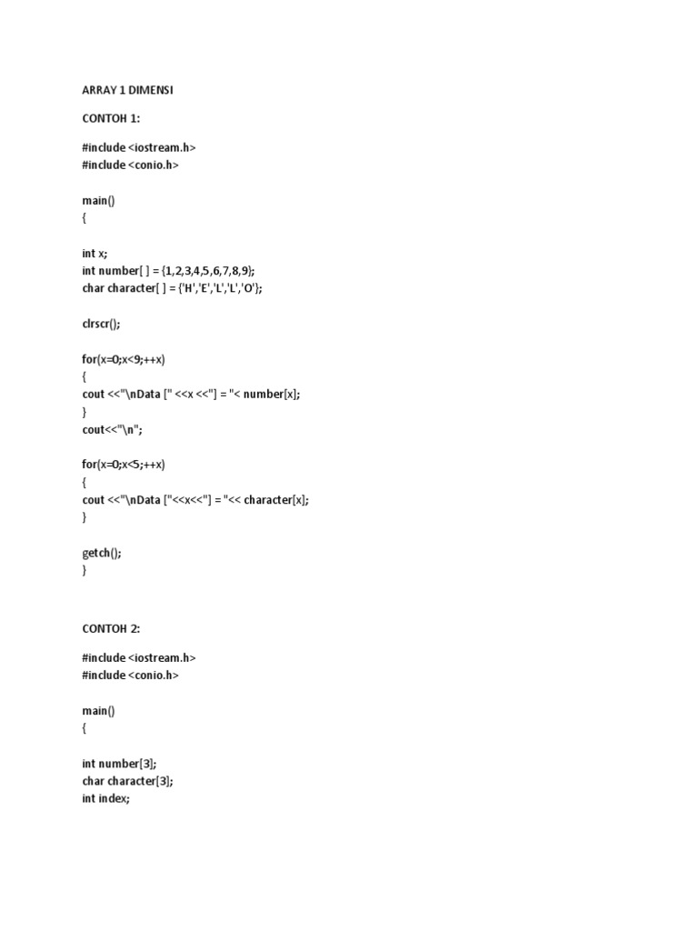 Meskipun deklarasi telah menetapkan bahwa monthdays adalah variabel array namun sesungguhnya tidak ada array yang diciptakan pada saat itu. Atau tipedata nilai1 nilai2 dst. Ini mengalokasikan memori untuk tipe data yang sama secara berurutan. Array 1 dimensi pada dasarnya senarai deretan variabel bertipe serupa. Jadi ada dua cara mendeklarasikan sebuah array berdimensi satu cara pertama cukup dengan menggunakan tipe data dan total index yang diinginkan contoh. Berikut adalah penjelasan array dimensi 1 dan array dimensi 2 secara singkat dan padat.