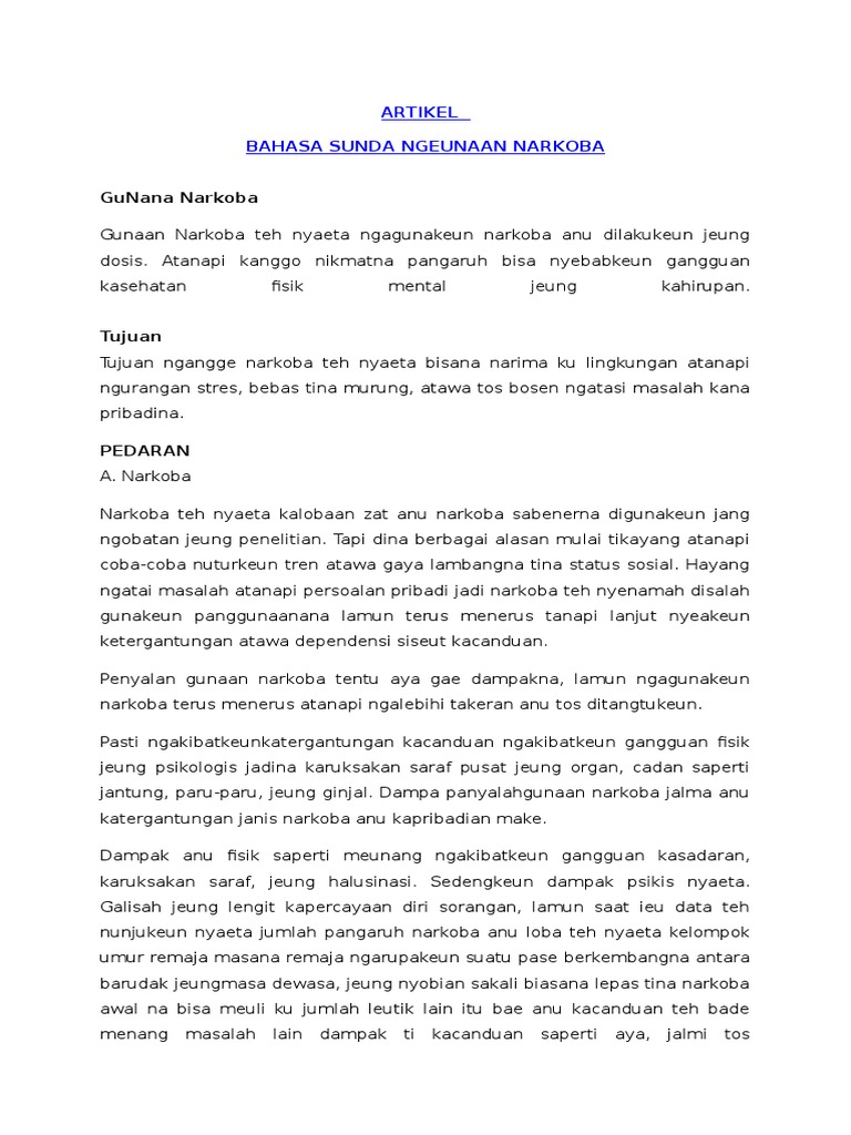 Contoh artikel bahasa sunda. Artikel bahasa sunda tentang budaya sunda dina taun 1905 rouffaer kungsi nyebutkeun yen kecap sunda asalna tina akar kecap sund atawa suddha dina bahasa sangsekerta nu miboga harti masihan sinar caang ngagurilap bersih suci murni teu aya kokotor atawa bodas. Contoh jurnal inilah contoh artikel bahasa sunda tentang narkoba yang anda perlukan. Belajar bahasa sunda penting sekali untuk kamu yang ingin atau akan tinggal di lingkungan yang mayoritas penduduknya berbahasa sunda baik itu sekolah maupun bekerja dan lain. Dalam kesempatan kali ini di tips cara sehat saya akan membahas tentang contoh artikel bahasa sunda narkoba dan tidak perlu lama dan lama mari langsung saja masuk ke dalam artikelnya eh tapi sebelumnya artikel ini bisa anda pelajari dan tambahkan lagi jika ada kekurangannya jika kita bicara narkoba bayangan di dalam pikiran kita pasti bahaya dan polisi hmm tapi apakah ia. Kumpulan contoh artikel bahasa sunda pendek. Hai sobat semua kali ini saya akan berbagi kumpulan contoh artikel bahasa sunda.