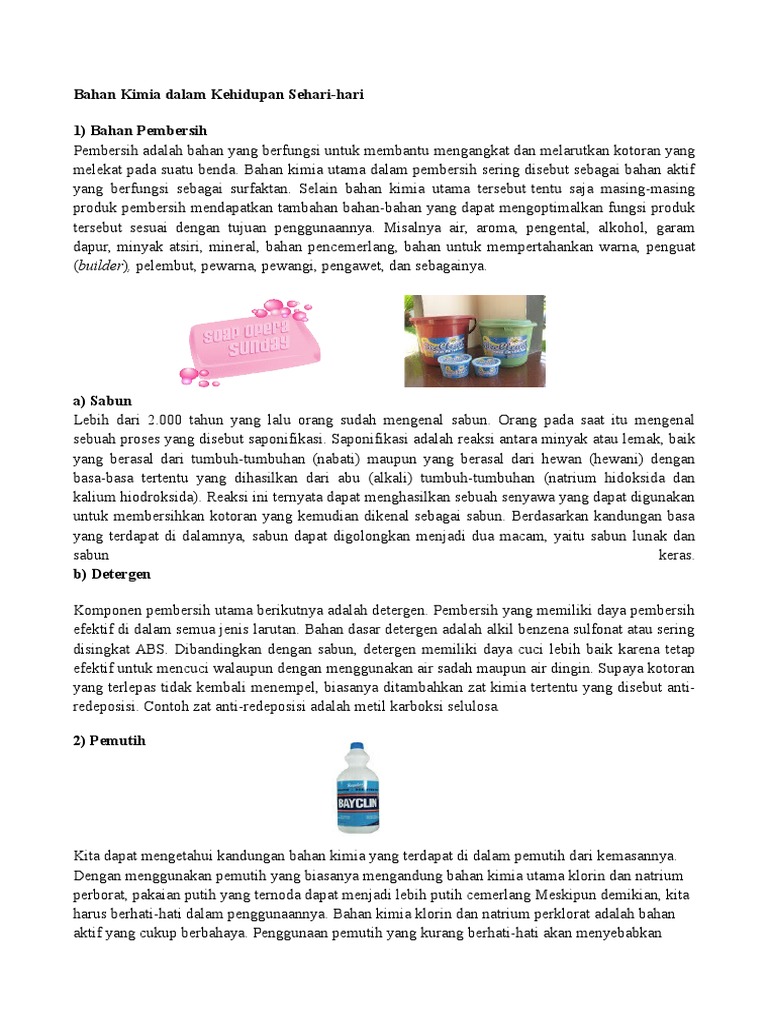 Contoh bahan kimia dalam kehidupan sehari hari. Asam klorida hcl asam klorida digunakan sebagai pengawet baja produksi senyawa organik dan anorganik kontrol ph dan netralisasi regenerasi penukaran ion pengolahan kulit pemurnian garam biasa pembersih rumah tangga konstruksi bangunan dan pengasaman sumur minyak. Ada reaksi saat kita minum obat menyalakan korek api dan menarik napas. Sabun pada rumah tangga secara garis besar digunakan untuk mencuci dan mandi. Senyawa tersusun dari dua unsur ataupun lebih lewat sebuah reaksi kimia. Ini hanya contoh kecil karena kita melihat dan mengalami ratusan ribu reaksi setiap. Kita dapat memperoleh bahan pewangi dari bahan alam maupun sintetik.