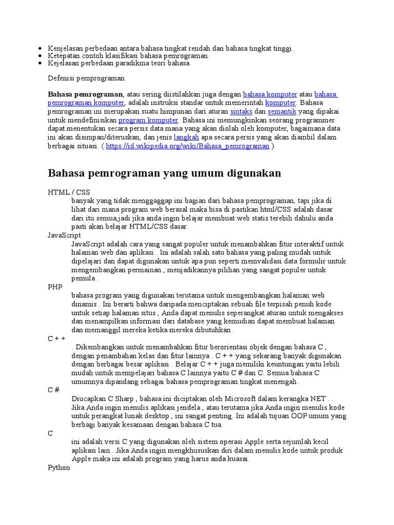 Contoh bahasa pemrograman tingkat rendah. Bahasa pemrograman tingkat tinggi adalah sebuah bahasa pemrograman yang jika dibandingkan dengan bahasa pemrograman tingkat rendah memiliki sifat lebih mudah digunakan lebih portabel mudah diadaptasikan antar platform dan lebih abstrak. Bahasa pemrograman pengertian jenis macam tingkatan contoh informatika adalah disiplin ilmu teknik yang menangani masalah transformasi atau pengolahan fakta simbolik dengan menggunakan komputer melalui proses proses logikamembahas tentang informatika bahasaannya tidak akan jauh dari bahasa pemrograman atau sering diistilahkan juga dengan bahasa komputer. Disebut tingkat menengah karena bisa masuk ke dalam bahasa tingkat tinggi maupun rendah. Beberapa sumber mengelompokkan assembly sebagai bahasa pemrograman tingkat rendah karena assembly mengonversi bahasa pemrograman ke bahasa mesin tanpa compiler atau interpreter melainkan hanya loader saja namun karena kita fokus pada pengklasifikasian bahasa pemrograman berdasarkan kedekatan bahasanya dengan bahasa yang dapat di mengerti manusia bahasa inggris maka di sini saya akan. Bahasa pemrograman tingkat tinggi. Dalam artikel ini kita akan menyoroti perbedaan utama antara bahasa pemrograman tingkat tinggi menengah dan tingkat rendah.