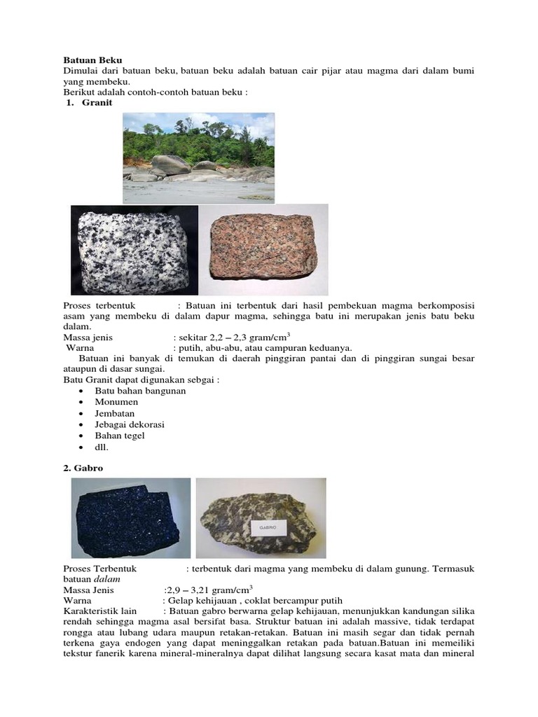 Contoh batuan beku luar seperti yang sudah dibahas sebelumnya bahwa batuan beku merupakan salah satu batuan penyusun litosfer bumi yang terbentuk akibat pendinginan dan pengkristalan magma. Berdasarkan tempat terbentuknya batuan beku dibedakan menjadi 2 jenis yaitu batuan beku dalam dan batuan beku luar. Contoh dari batuan ini adalah batuan granit batuan peridotim dan juga batuan gabro. Contoh batuan beku dalam nah dalam hal ini batuan beku atau batuan intrusive atau batuan plutonik merupakan satu dari 3 jenis batuan penyusun litosfer bumi. Karena terbentuk dengan lambat batuan beku umumnya memiliki ciri utama berupa kandungan mineralnya yang relatif besar. Contoh batuan beku dalam batuan beku dalam adalah batuan beku yang terbentuk dari proses pembekuan magma lambat yang terjadi di dalam permukaan bumi.