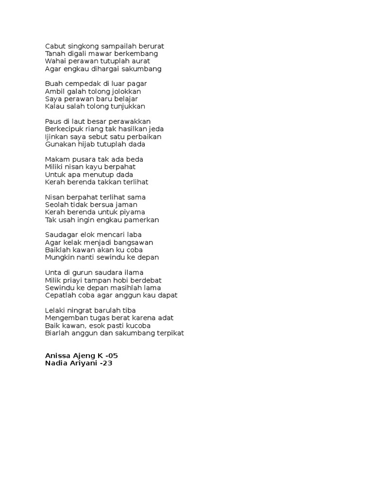 Pengertian jenis ciri ciri dan contoh pantun semua orang suka pantun. Pengertian dan contoh pantun nasehat agama berbalas orang tua dan anak untuk bahan belajar pantun siapa yang tidak menyukainya. Dapat disimpulkan bahwa kata pantun mempunyai makna yang mengatur setiap pembacanya untuk memahami nasehat dan makna yang terdapat dalam kandungan isi pantun tersebut. Bunga melati bunga mawar bunga mawar merah warnanya. Untuk apa serius belajar kalau akhirnya remedy juga. 40 contoh berbalas pantun nasehat berbalas pantun nasehat adalah pantun yang dibuat berisi nasehat nasehat dilakukan dengan cara berbalas.
