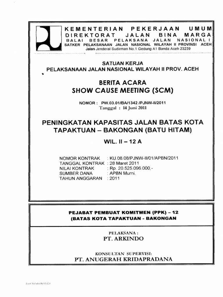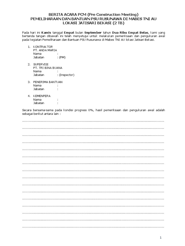 Pelaksanaan pekerjaan yang dapat diselenggarakan segera setelah kontrak ditandatangani atau selambat lambatnya 7 tujuh hari setelah diterbitkannya surat perintah mulai kerja spmk sampai dengan selesainya berita acara rapat persiapan pelaksanaan kontrak dsn merupakan bagian dari dokumen proyek bagi pelaksana konstruksi dilingkungan balai besar. Berita acara rapat persiapan pelaksanaan pekerjaan dalam rangka pengendalian pelaksanaan pekerjaan untuk memastikan bahwa pelaksanaan pekerjaan yang akan dilakukan sesuai dengan yang telah ditetapkan dalam dokumen kontrak maka perlu diadakan rapat persiapan pelaksanaan pre construction meeting untuk menghasilkan kesepakatan kesepakatan beberapa materi yang dapat menimbulkan masalah dalam. Rapat pcm dituangkan dalam berita acara dan ditanda tangani oleh 3 tiga pihak. Academiaedu is a platform for academics to share research papers. Pejabat pembuat komitmen ppk.