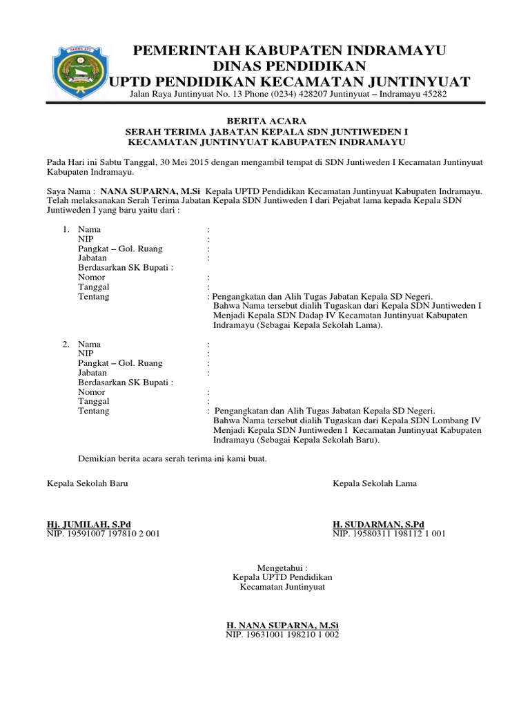 Contoh berita acara serah terima jabatan kepala sekolah. Contoh surat serah terima jabatan terbaru serah terima jabatan dalam sebuah perusahaan atau organisasi adalah hal yang sudah umum dilakukan. Contoh format berita acara serah terima jabatan kepala sekolah sertijab ini merupakan salah satu perangkat administrasi sertijab yang diperlukan. Sertijab kepala sekolah susunan acara serah terima jabatan kepala sekolah ketika dalam rangka pergantian kepala sekolah pastinya membutuhkan naskah mc sera terima jabatan yang bagus. Kali ini admin wiwa pedia akan memberikan contoh urutan atau susunan acara serah terima jabatan kepala sekolah. Surat serah terima jabatan. Contoh naskah memori serah terima jabatan.