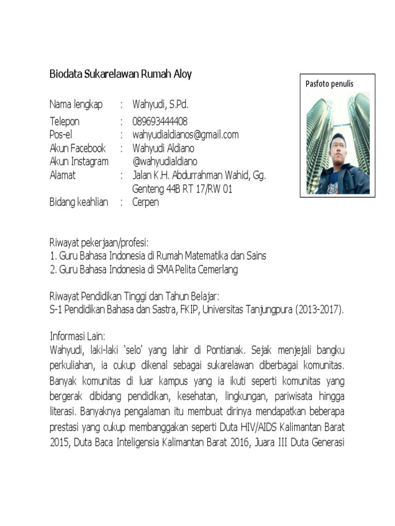 Beranda sastra contoh biodata narasi bagi penulis pemula contoh biodata narasi bagi penulis pemula ajeng dini utami minggu februari 02 2014. Contoh biodata penulis cerpen contoh biodata diri contoh biodata dalam bahasa inggris contoh biodata siswa contoh biodata guru contoh biodata penulis contoh biodata mahasiswa contoh biodata pelajar contoh biodata taaruf contoh biodata tokoh murid contoh biodata narasumber. Rabu juni 08 2016. Jumat februari 14 2014. Di dalam biografi terangkum dengan jelas biodata dan segala sesuatu yang berkaitan dengan hidup seseorang termasuk prestasi yang pernah dicapai. Saat ini penulis sedang menempuh pendidikan di sebuah kota di jawa timur.