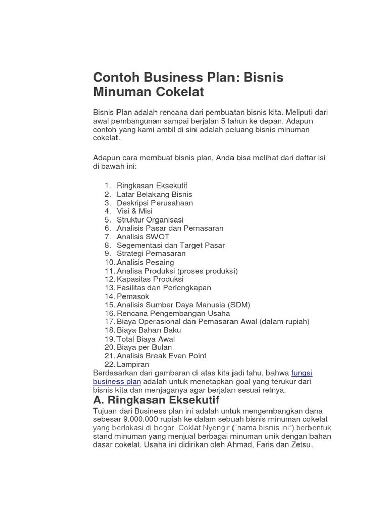 Contoh bisnis plan minuman. Riru ngindra 1 april 2014 at 2340. Hampir tidak ada orang yang tidak suka cokelat. Laporan hasil kunjungan industri ke yogyakarta maret 2 februari 13 2015 21 september 2 agustus 15 januari 4 2014 4 februari 4 tema tanda air. Bisnis plan adalah rencana dari pembuatan bisnis kita. Bidang bisnis yang kami jadikan kasus dalam contoh kali ini adalah bisnis cafe cokelat. Adapun contoh yang kami ambil di sini adalah peluang bisnis minuman cokelat.