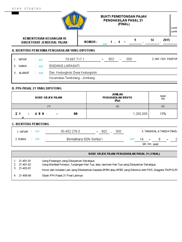 Contoh bukti potong pajak. Berikut ini salah satu contoh bukti potong pph yakni pph pasal 23. Aplikasi excel ini fungsi pokoknya adalah untuk membantu membuat bukti potong dengan cara mengisi di sheet yang dsediakan nantinya secara otomatis isian identitas dan penghasilan serta beban akan dipindahkan di bukti potong 1721 a1a2 dan nge link alias ngisi otomatis di formulir 1770 sss dan masih adalagi lho yaitu ngisi juga di csv a1 yang bisa digunakan di aplikasi e spt pph 21. Dengan adanya pemotongan ini. Bukti potong pasal 2126zip. Bagi anda yang sering melakukan pembuatan buki pemungutan pph pasal 22 bukti pemotongan pph pasal 23 26 15 dan 4 ayat 2 kami merekomendasikan software krishand withholding tax untuk membantu memudahkan pekerjaan tersebut. Fungsi dari formulir 1721 a1 adalah sebagai kredit pajak dapat juga digunakan untuk mengawasi pajak yang sudah dipotong oleh pemberi kerja.
