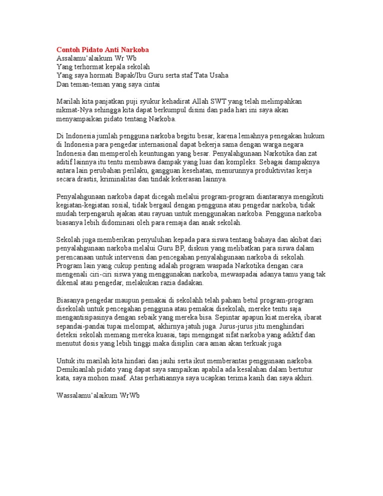 Contoh ceramah tentang narkoba beserta dalilnya. Sholawat dan salam mari kita panjatkan kepada nabi besar muhammad saw semoga beliau senantiasa di tempatkan oleh allah di sisi nya. Contoh teks ceramah ceramah merupakan kegiatan penyampaian pesan yang mempunyai tujuan untuk memberikan nasehat petunjuk maupun petuah kepada pendengar secara lisan. Related posts to contoh ceramah tentang narkoba beserta dalilnya contoh ceramah tentang narkoba beserta dalilnya 2018 04 21t211900 0700 rating. Kumpulan contoh kultum dan ceramah terbaik lengkapcontoh pembukaan kultumkultum tentang ramadhankultum tentang remaja nasihat untuk remaja muslim kultum yang bertema ahlaq terpujipenutup kultum. Blog contohian memiliki banyak ko. Mulai dari contoh ceramah tentang fitnah ceramah tentang ghibah ceramah tentang generasi muda contoh ceramah tentang hijrah contoh ceramah larangan pacaran contoh ceramah tentang rezeki contoh ceramah tentang riba ceramah bulan suci ramadhan dll.
