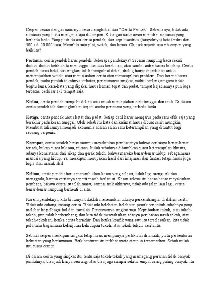 30 contoh surat lamaran kerja yang bagus dan baik beserta cara membuatnya. Dan tiap kata yang keluar dari mulut tokoh tokoh juga harus berfungsi dalam memunculkan tema cerita. Cerpen adalah cerita yang panjangnya berkisar 5000 kata atau kira kira 17 halaman dimana isinya terpusat dan lengkap pada dirinya sendiri. Sebagai gambaran ada 3 hal yang bisa menjadi acuan untuk membantu mempermudah dalam menulis sebuah cerpen yang baik. Nah itulah beberapa langkah langkah dan tips cara membuat cerpen yang baik dan benar. Membaca dan menyimak karya aslinya hingga benar benar memahami apa isi yang disampaikan di dalam karya tersebut.