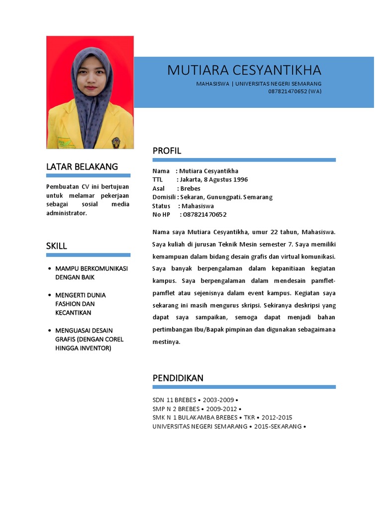 Contoh cv mahasiswa yang masih kuliah. Namun sesungguhnya masih banyak pencari kerja yang belum tahu bagaimana langkah menulis atau membawa dampak cv bersama dengan benar. Surat lamaran kerja jika masih kuliah pengen cari kerja sambil kuliah buat meringankan beban orang tua di rumah nih gansist saya kasih conth untuk buat surat lamaran kerja yang baik dan benar nih surat lamaran kerja dah ane praktekin dan alhamdulillah sudah berhasil di beberapa tempat kerja yang ane lamar dan diterima. Contoh cv mahasiswa cv atau curriculum vitae adalah salah satu persyaratan yang digunakan untuk melamar kerja atau mendaftar ke sebuah perguruan tinggi atau sekolah. Contoh surat lamaran kerja untuk yang masih kuliah melamar kerja bagi mahasiswa yang sedang kuliah memang bukan hal yang salah. Sekian yang dapat fachri aja bagikan tentang contoh curriculum vitae mahasiswa yang masih kuliah dimana contoh surat lamaran kerja untuk mahasiswa danformat cv untuk mahasiswa seperti di atas akan membuat hrd lebih tertarik dengan cv buatanmu. Contoh cv lewat email.