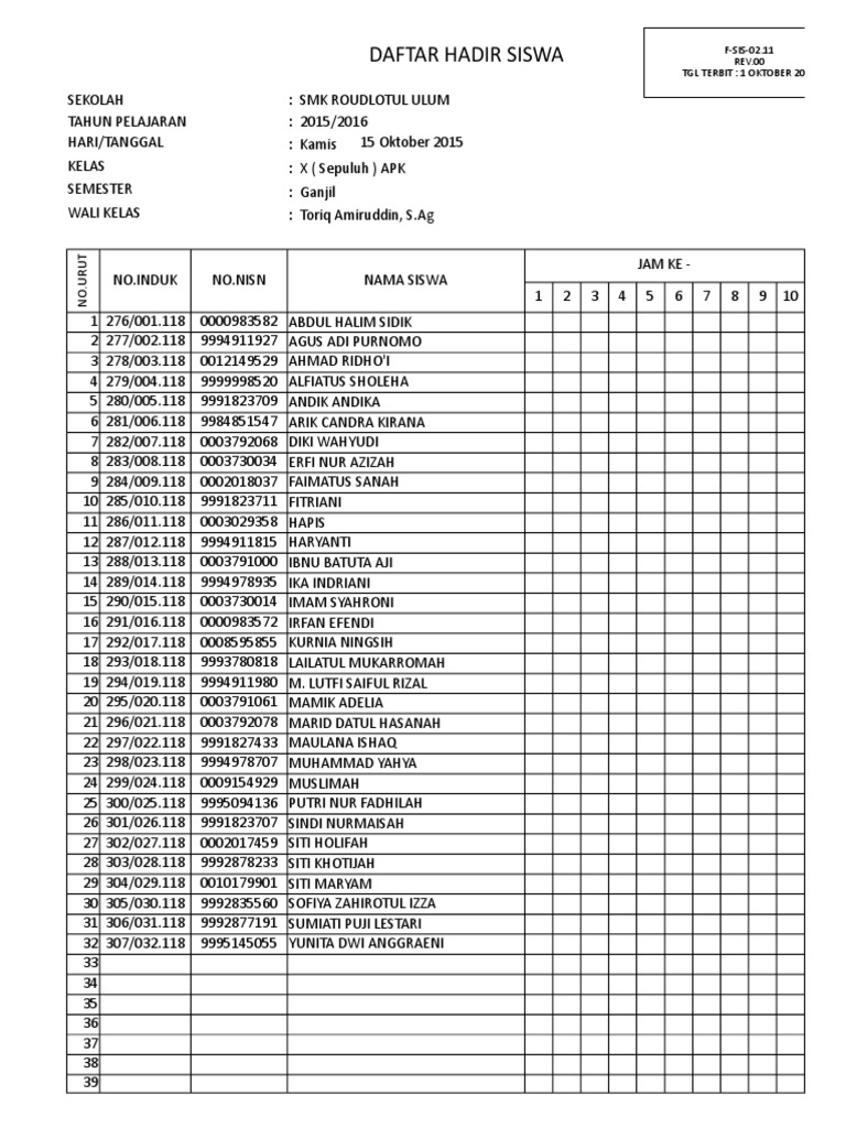 Isi yang ada pada contoh absensi dan daftara hadir siswa ini mencakup semua bulan mulai dari januari februari maret april mei juni juli agustus sebtember desember semua komplit anda bisa menggunakan format aplikasi absensi ini sebagai sumber referensi untuk absensi siswa pada sekolah sd sekolah smp sekolah sma ataupun smk. Aplikasi absensi ini disertai dengan petunjuk penggunaan secara. Daftar hadir guru pembimbing dan siswa ekstrakurikuler sepak bola mi al huda banyuarang tapel 2013 2014. Daftar hadir siswa format word doc selain untuk mencatat kehadiran siswa buku absensi ini merupakan berkas yang digunakan sebagai alat untuk mengumpulkan data dan bisa menjadi salah satu poin dalam pemberian nilai terhadap peserta didik dalam bentuk nilai apresiasi pada proses kegiatan pembelajaran. Selanjutnya adalah kita membuat halaman atau lembar kerja di spreadsheet ini sama halnya dengan exel pada microsoft exel jadi data daftar hadir siswa akan terkumpul di sini. Bagi bapak dan ibu guru serta teman teman pendidik yang saat ini belum memiliki contoh format daftar hadir siswa yang di gunakan untuk mengabsen siswa dalam setiap harinya pada pembelajaran kurikulum 2013 maka pada kesempatan kali ini saya akan membagikan contoh format daftar hadir siswa di kelas versi kurikulum 2013.