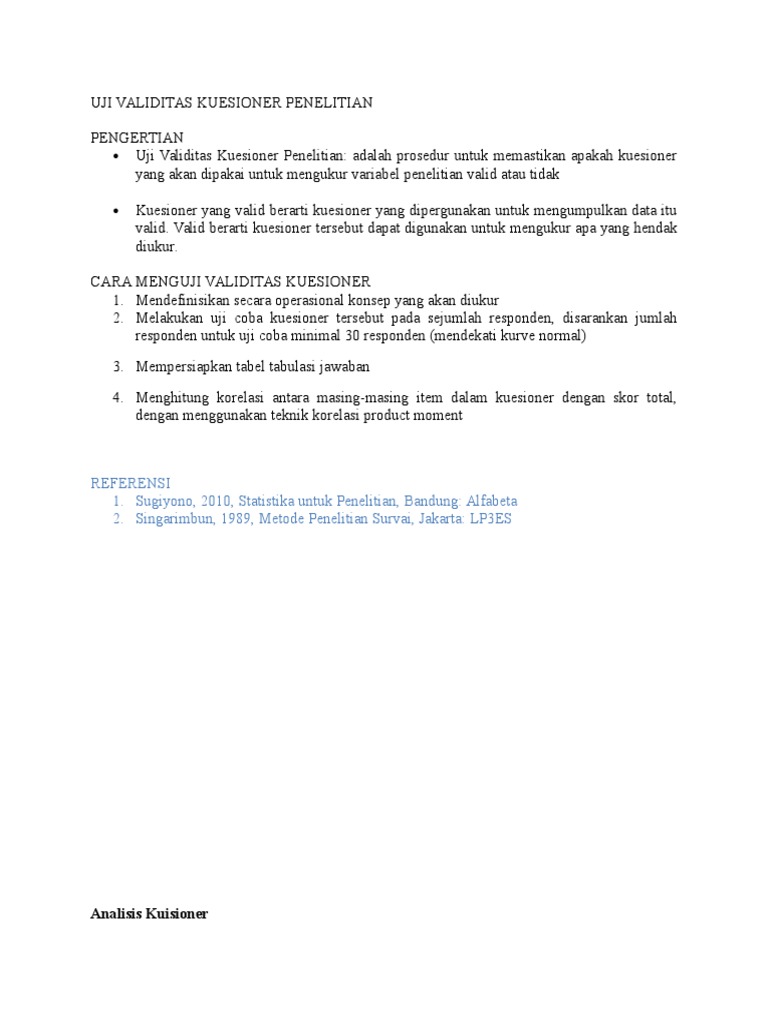 Uji validitas dan reliabilitas instrumen kuesioner merupakan tahapan pengujian kuesioner yang telah disusun untuk membuktikan apakah instrumen tersebut layak digunakan dan dipercaya dalam mengukur variabel yang digunakan atau tidak. Kuesioner memiliki kesamaan dengan angket karena kuesioner jawaban diisi sendiri oleh responden tanpa harus ditanyakan langsung oleh peneliti. Kuesioner yang berisi perpaduan pertanyaan terbuka dan tertutup. Masalah yang sering dihadapi adalah hasil pengujian data yang tidak valid dan tidak reliabel. Yah tapi itu akan menambah biaya lagi hehe. Berapa lama saudara telah bekerja di cv.