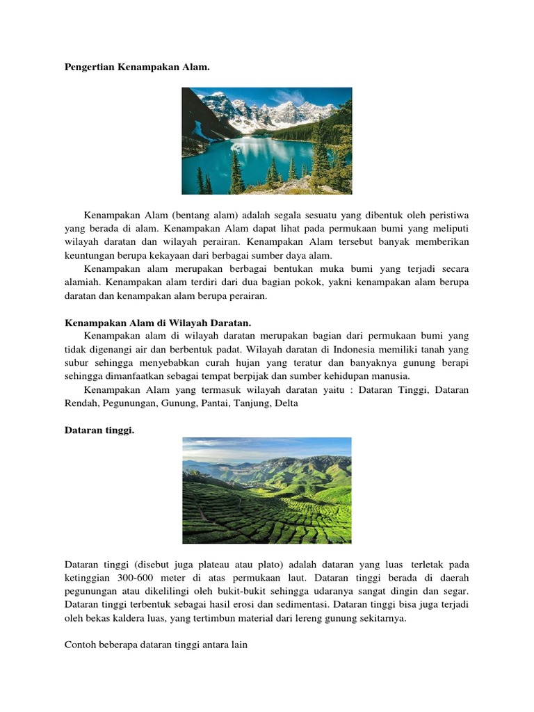 Contoh dataran tinggi di indonesia. Datarn tinggi merupakan salah satu dari bentuk permukaan bumi yang ada di planet bumi dan juga dapat kita temukan di indonesia. Dataran tinggi terbentuk sebagai hasil erosi dan sedimentasi. Dataran tinggi tibet berada disebelah selatan tengah asia merupakan dasar lembah yang datar pada ketinggian sekitar 15000 kaki diatas permukaan air laut dan dibagian selatannya dibatasi oleh pegunungan himalaya. Contoh dataran tinggi di indonesia diantaranya dataran tinggi dekkan dataran tinggi gayo dataran tinggi dieng dataran tinggi malang. Contoh dataran tinggi di indonesia antara lain adalah dataran tinggi dekkan dataran tinggi gayo dataran tinggi dieng dataran tinggi malang. Dataran rendah merupakan jenis daratan pada permukaan bumi yang berupa hamparan luas tanah dengan tinggi kurang dari 200 m di atas permukaan laut.