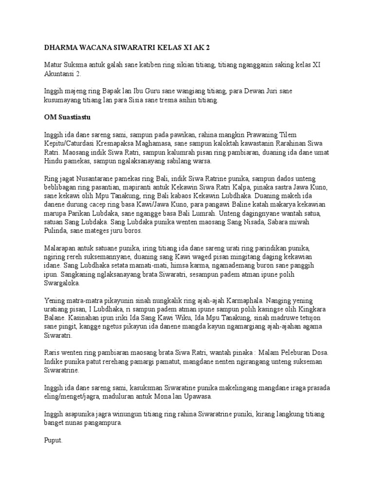 Kewentenang titiang sane kalintang tambed pacang nyobyahang indik wacana tri hita karana puniki nenten ja wenten manah titiang jaga nasikin segara utawi ngajahin ratu ida dane sareng sami sane pastika sampun wikan ring indike punika. Pada awal tahun 2013 merintis mendirikan dan memimpin hindu research center sebuah organisasi yang bergerak di bidang pendidikan penelitian dan pengabdian masyarakat mengajak generasi muda belajar agama hindu diskusi ceramah dharma wacana dharma tula punia buku menganalisis permasalahan agama dialog agama menyerap aspirasi umat serta memberi inspirasi dan motivasi bagi umat hindu. Tahap pembelajaran dalam pembuatan naskah dharma wacana memang tidak semudah yang kita bayangkan bayak pemikiran yang akan timbul ketika kita memaksa untuk mencari apa yang ingin kita paparkan dalam berdharma wacana baik itu di lingkungan masyarakat ataupun di kalangan pelajarmahasiswa. Kumpulan dharma wacana blog ini membahas seputar adat istiadat budaya dan ritual dalam agama hindu. Klik di sini untuk informasi file lengkap contoh wacana singkat tentang pendidikan selengkapnya. Susila yang berdasarkan ajaran ajaran dharma agama baru bisa meresap didalam diri kita masing masing.