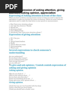 Contoh dialog asking for attention. Adapun beberapa ungkapan yang tergolong sebagai asking for attention antara lain. 5 contoh dialog percakapan asking for attention meminta perhatian dalam bahasa inggris terbaru asking for attention adalah salah satu jenis ungkapan yang digunakan untuk menyatakan permintaan seseorang kepada lawan bicaranya untuk memperhatikan dengan apa yang di sampaikan. Dalam situasi tertentu seseorang sering meminta perhatian asking for attention dan sebagai lawan bicara yang baik maka akan menunjukkan perhatiannya showing attention. Expressing attention adalah cara yang digunakan untuk meminta seseorang memfokuskan perhatiannya kepada kita atau sebaliknya kita yang memfokuskan perhatian kepada orang yang sedang berbicara. This conversation happened in front of the class. 5 contoh dialog percakapan giving attention memberi perhatian dalam bahasa inggris terbaru perhatian atau attention merupakan salah satu ungkapan atau respon kita terhadap seseorang atau sesuatu yang berada dihadapan kitapada hari ini kita akan menghadirkan materi yang berhubungan dengan perhatian yaitu giving attention for othersadapun yang tergolong didalam the giving attention.