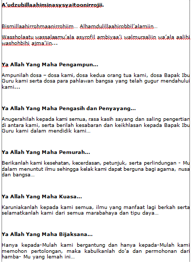 Susunan upacara bendera yang di laksanakan di setiap sekolah pada hari senin dan hari besar nasional telah diatur dalam uu atau permendikbud nomor 22 tahun 2018. Namun jika tidak ada mungkin teks doa upacara bendera mts smp sma ini dapat dijadikan sebagai referensi. Nah bagi bapakibu guru yang membutuhkan contoh doa upacara bendera hari senin terbaru tahun 2018 bisa mengunduhnya pada tautan dibawah ini. Bahwa dalam rangka memperlancar pelaksanaan proses kegiatan upacara senin pagi pada sdn 001 kasikan kec. Pedoman upacara bendera di sekolah dalam pelaksanaan kegiatan upacara di sekolah pembaca doa bertugas membaca doa pada saat dan tempat yang telah ditentukan. Assalaamu alaikum wr wb yang saya hormati bapak kepala sma negeri 22 jakarta bp.