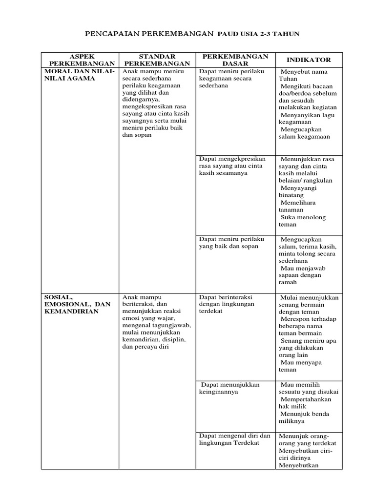 Contoh dokumen pencapaian perkembangan anak paud berdasarkan 6 aspek. Pada masa usia dini anak mengalami masa keemasan the golden years yang merupakan masa dimana anak mulai pekasensitif untuk menerima berbagai rangsangan. Standar tingkat pencapaian perkembangan anak usia dini selanjutnya disebut stppa adalah kriteria tentang kemampuan yang dicapai anak pada seluruh aspek perkembangan dan pertumbuhan mencakup aspek nilai agama dan moral fisik motorik kognitif bahasa sosial emosional serta seni. Pengertian pertumbuhan anak adalah pertambahan berat dan tinggi badan yang mencerminkan kondisi kesehatan dan gizi yang mengacu pada panduan pertumbuhan anak dan dipantau menggunakan instrumen. Aspek aspek perkembangan anak usia dini. Dari 6 aspek perkembangan anak usia dini diatas salah satu yang saya sukai adalah pada point 1 yaitu nilai agama dan moral. Menurut aku memang penting untuk mengajarkan agama dan moral kepada anak sejak dini.
