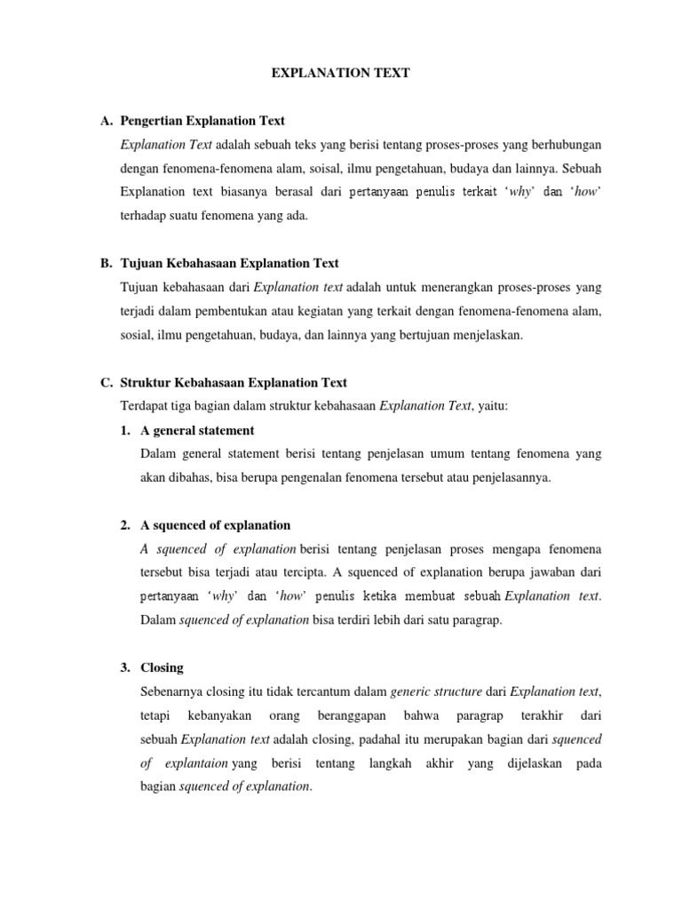 Dengan kata lain explanation text adalah sebuah text yang berfungsi untuk menjelaskan proses terjadinya suatu peristiwa atau suatu hal secara detail contoh peristiwa terjadinya hujan dari uap air atau tsunami dan kejadian lainya yang memiliki unsur kejadian alam budaya sosial dan lain. Sebuah explanation text biasanya berasal dari pertanyaan penulis terkait why dan how terhadap suatu fenomena yang ada. Sebagaimana disebutkan dalam pengertian teks explanation jenis teks ini berfungsi untuk mejelaskan bagaimana dan kenapa suatu gejala alam dan sosial itu terjadi. Masih ingat apa saja text dalam bahasa inggris. Pengertian explanation text sesuai dengan namanya explanation text adalah sebuah tulisan yang memberikan penjelasan terperinci tentang beragam hal yang ada di sekitar kita mulai dari bencana alam budaya seni ilmu pengetahuan dan hal hal menarik lainnya. Pengertian tujuan contoh dan struktur explanation text dalam bahasa inggris.