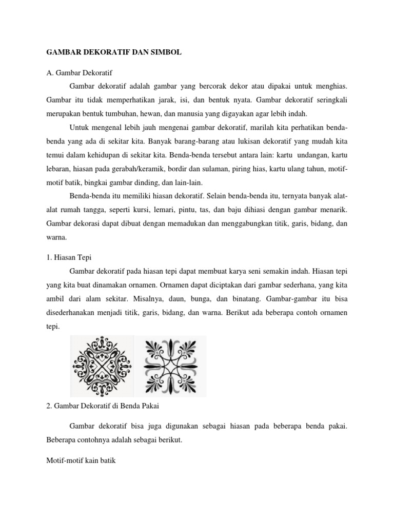 Bentuk bentuk objek di alam disederhanakan dan digayakan tanpa meninggalkan bentuk aslinya. Komposisi gambar bunga tentunya cukup menarik untuk diwarna. Gambar dekoratif mirip seperti gambar pola pattern atau gambar semi abstrak sama halnya seperti batik yang menunjukan keanekaragaman suatu pola tertentu. Contoh gambar dekoratif yang menyerupai binatang brainly co id. Untuk memperoleh objek gambar dekoratif perlu dilakukan deformasi atau penstiliran alami. Kebanyakan seniman masih menggunakan bunga sebagai objek mereka dikarenakan bunga memiliki jutaan pesona dan keindahan yang tinggi serta merupakan simbol keindahan yang memang diutamakan dalam karya seni rupa.