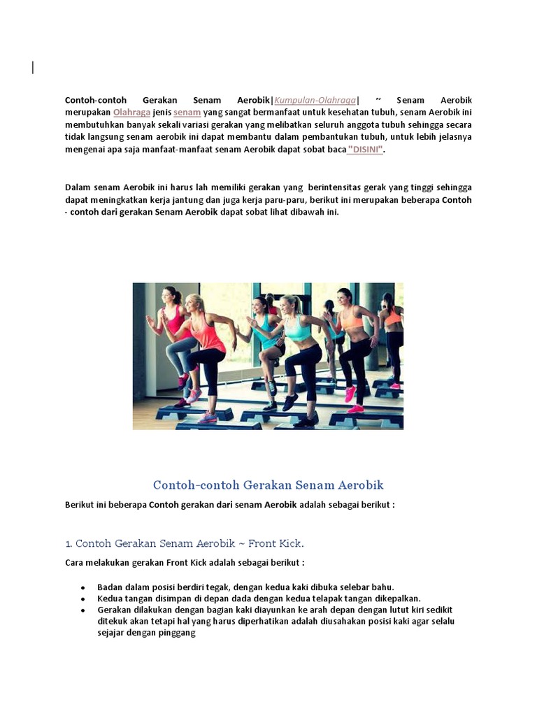 Materi makalah teknik senam aerobik meliputi dari beberapa pengertian gerakan bentuk fase teknik gerakan kaki contoh dan gambar supaya mudah di pahami. Aerobik merupakan salah satu cabang olahraga yang dilakukan menggunakan dengan gerakan seluruh bagian tubuh sehingga sudah banyak orang yang melakukan aktivitas yang semacam ini karena dapat dilakukan dari kalangan ibu ibu dengan. Irama musik dalam aerobik berfungsi sebagai panduan gerak pemberi motivasi dan semangat peserta yang melakukan senam aerobik. Contoh gerakan dalam senam aerobik senam aerobik menuntut berbagai variasi gerakan yang sangat banyak.