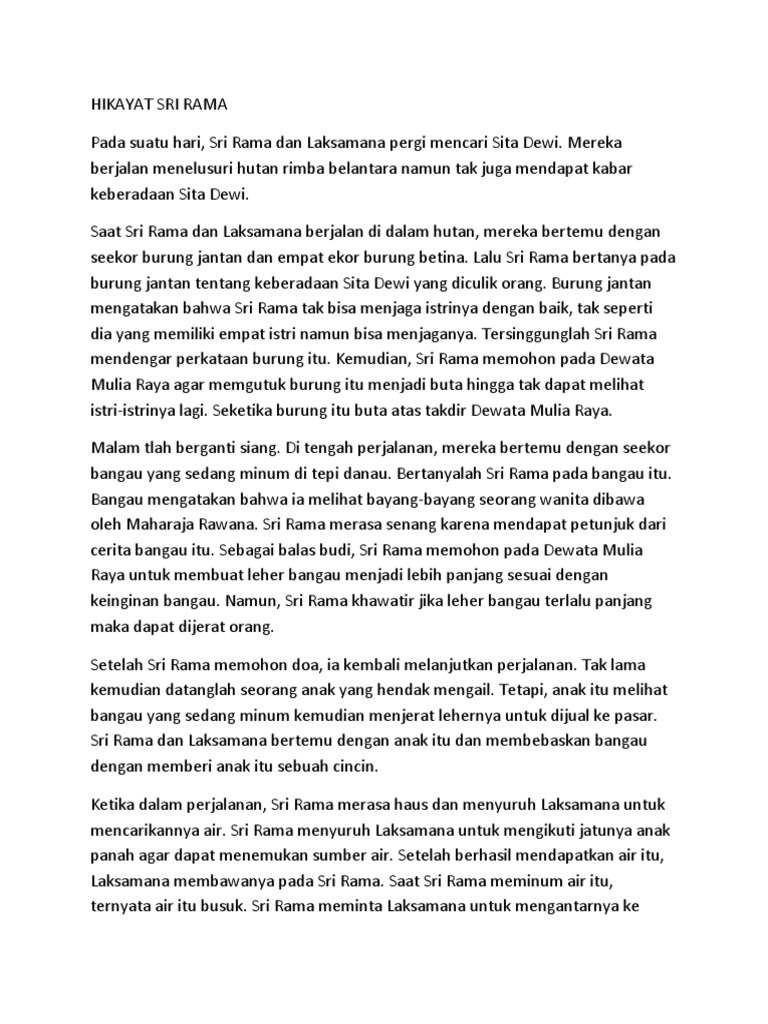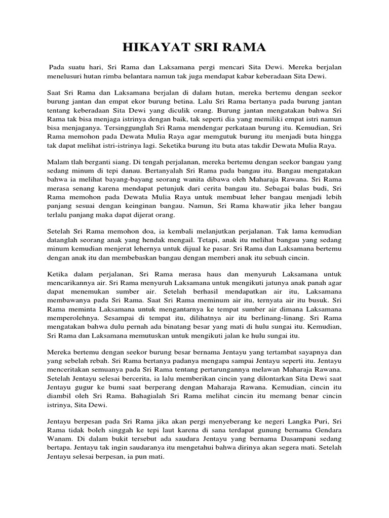 Contoh hikayat sri rama. Pada suatu hari sri rama dan laksamana pergi mencari sita dewi. Mereka berjalan menelusuri hutan rimba belantara namun tak juga mendapat kabar keberadaan sita dewi. Hikayat ini memiliki dua versi yang agak berbeda. Posting pada bahasa indonesia ditag 12 unsur intrinsik novel amanat dalam hikayat biasanya ditulis secara bagaimana persamaan hikayat dengan cerpen cara menentukan unsur intrinsik cerpen cara menentukan unsur intrinsik yang dominan cerita hikayat sri rama cerita teks hikayat contoh hikayat melayu contoh nilai sosial dalam cerpen contoh soal alur dan jawabannya contoh soal dan. Saat sri rama dan laksamana berjalan di dalam hutan mereka bertemu dengan seekor burung jantan dan empat ekor burung betina. Versi yang diterbitkan oleh roorda van eysinga dan versi yang diterbitkan oleh w.