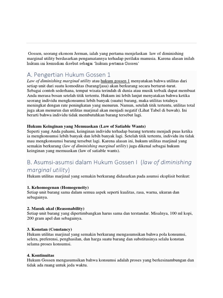 Untuk pengertian hukum gossen 1 sendiri yaitu bila pemenuhan kebutuhan suatu barang dilakukan terus menerus maka rasa nikmat dari barang tersebut akan meningkat. Hukum gossen 1 pertama merupakan generalisasi dari fakta berdasarkan pengalaman jika pemuasan keperluan terhadap suatu jenis benda tertentu dilakukakan terus menerus kenikmatannya akan terus menerus berkurang sampai akhirnya mencapai suatu kejenuhan. Sebagai contoh sederhana tempat wisata terindah di dunia atau musik terbaik dapat membuat anda merasa bosan setelah titik tertentu. Hasil penyelidikan gossen ini menghasilkan hukum gossen i dan ii. Sebelum memahami hukum gossen anda perlu mengenal konsep kegunaan total total utility dan kegunaan marginal marginal. Pemuasan kebutuhan secara vertikal adalah pemuasan kebutuhan terhadap satu jenis barang sedangkan pemuasan horizontal adalah pemuasan kebutuhan pada berbagai jenis barang.