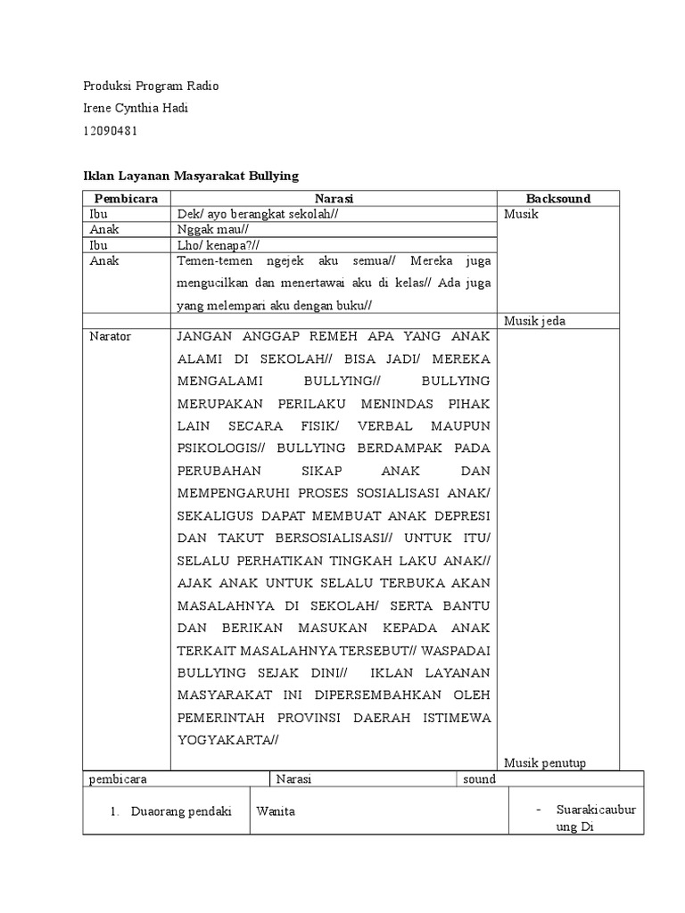 Contoh iklan di radio. Published on august 26. Iklan ini saya buat pribadi atas dasar melengkapi tugas yang diberikan pada mata kuliah periklanan materi iklan radio. Iklan di radio seperti tidak berjarak. Setelah itu di buatkan konsep naskah iklan radio dengan mempertimbangkan skenario iklan apakah dialog atau monolog atau lainnya. Lalu menentukkan musik atau menggunakan sound fx dengan tujuan untuk menciptakan suasana yang mendukung skenario. Kualitas iklan pun akan mempengaruhi reputasi sebuah perusahaan atau pebisnis yang ingin mempromosikan produknya.