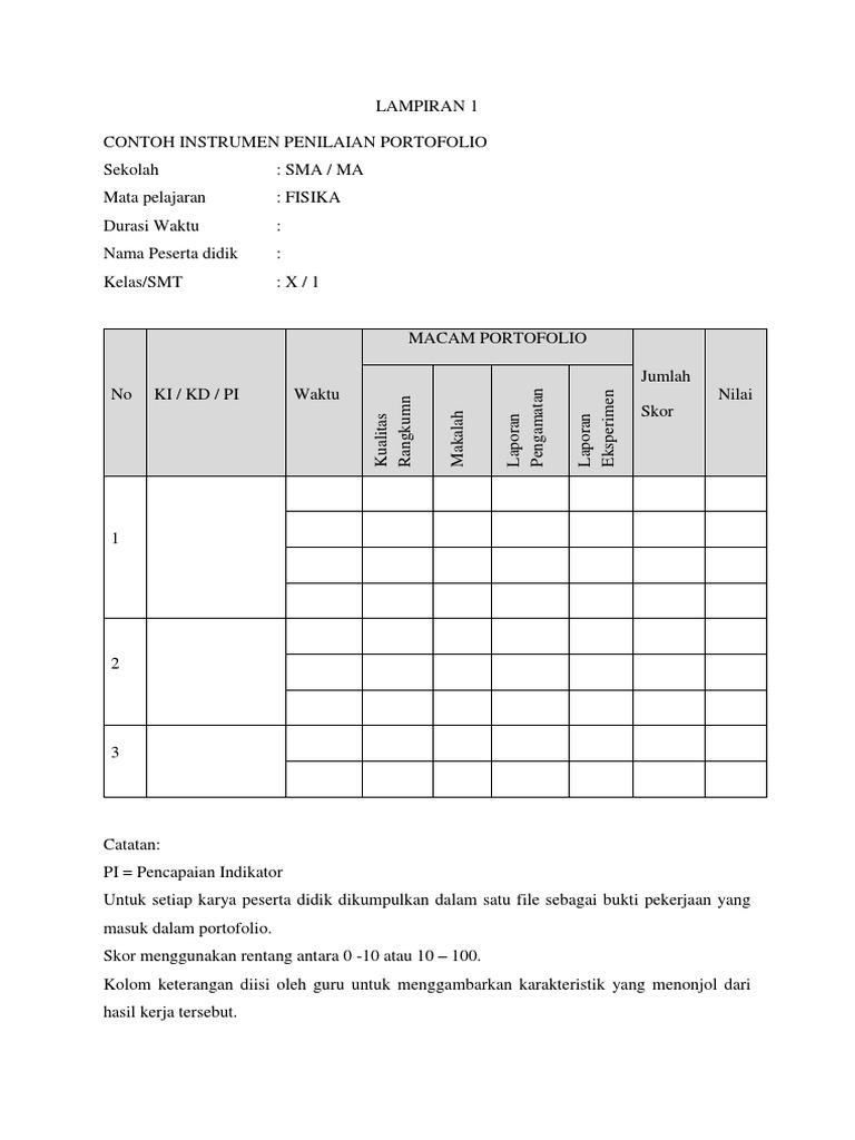Contoh instrumen penilaian portofolio. 4 selalu apabila selalu. Portofolio sebenarnya diartikan sebagai suatu wujud benda fisik sebagai suatu proses. Contoh format penilaian portopolio siswa sd smp sma kurikulum 2013 pada kesempatan yang berbahagia ini admin akan berbagi kepada anda semua berkaitan dengan pengetian langkah langkah dan format penilaian portopolio. Mapel pkn vi kd 11 menghargai semangat kebhinnekatunggalikaan dan keragaman agama suku bangsa. Menghayati dan mengamalkan perilaku jujur disiplin tanggungjawab peduli gotongroyong kerjasama toleran damai santun responsif dan pro aktif dan menunjukkan sikap sebagai bagian dari solusi atas berbagai permasalahan dalam berinteraksi secara efektif dengan lingkungan sosial dan alam serta dalam menempatkan diri sebagai cerminan bangsa dalam pergaulan dunia. Contoh format penilaian konsep diri.