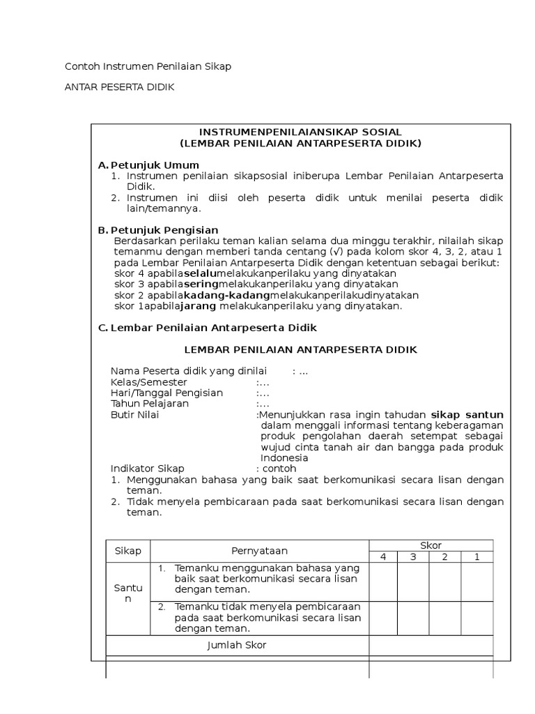 Contoh instrumen penilaian sikap. Instrumen penilaian harus memenuhi persyaratan substansimateri konstruksi dan bahasa. Teknik dan instrumen penilaian sikap. Pengantar berikut ini beberapa contoh instrumen penilaian yang meliputi. Contoh instrumen penilaian kompetensi sikap. Instrumen yang digunakan untuk observasi penilaian diri dan penilaian antarpeserta didik adalah daftar cek atau skala penilaian rating scale yang disertai rubrik. Penjelasan mengenai keempat teknik tersebut silahkan klik di sini.