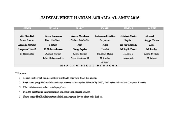 Senin hendrik ardi selasa bagus ahmad rabu fahmi syamnur. Sudah seharusnya setiap sekolah tepatnya di dalam kelas memiliki jadwal tugas dimana para peserta didik memiliki tanggung jawab untuk menjaga kebersihan. Ahad bersih2 sadar sekitar. Sampai disini selesai sudah kita membuat jadwal piket dengan menggunakna microsoft word. Ketika pertama kali membuka akan keluar form password isi dengan. Jadwal piket kebersihan kelas atau disebut juga jadwal piket regu kerja kebersihan kelas terbaru ini merupakan kegiatan rutin siswa membersihkan kelas dari hari senin sd sabtu.