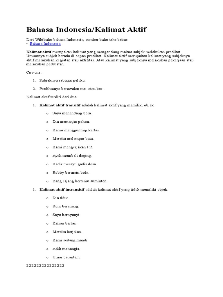 Kalimat ini mempunyai beberapa jenis dimana dua diantara jenis jenis kalimat aktif tersebut adalah kalimat aktif transitif dan kalimat intransitif. Kalimat ini biasa disebut juga sebagai kalimat subjek ataupun tindakan. Contoh kalimat transitif dan intransitif dalam bahasa indonesia kalimat aktif adalah kalimat yang subjeknya melakukan suatu tindakan atau perbuatan. Kalimat aktif intransitif kalimat aktif intransitif adalah kalimat aktif yang tidak dilengkapi dengan objek sehingga pola kalimatnya berbentuk s p atau s p k.
