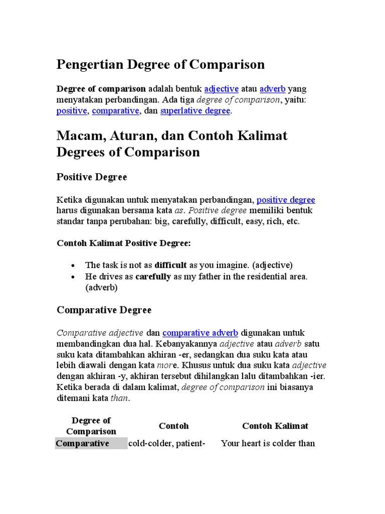 Comparative degree adalah membandingkan dua objek atau lebih. 20 contoh soal comparative degree adjective dan jawabannya beberapa orang yang telah mempelajari bahasa inggris pasti tidak asing lagi dengan degree of comparisondegree of comparison adalah salah satu contoh dari bermacam macam bentuk dalam bahasa inggris untuk membandingkan orang satu dengan yang lainnya atau benda satu dengan benda yang lainnya. Kini saatnya menambah pengetahuan tentang perubahan adjective secara beraturan regular form. Positive degree berupa bentuk standar adjective dan adverb tanpa perubahan apapun. 5 jenis comparative degree contoh kalimat lengkap materi seputar grammar superlative degree dalam bahasa inggris dengan metode paling lengkap dan mudah. Berbeda dengan positive degree yang berfungsi untuk menyatakan kesetaraan comparative degree bertujuan untuk menyatakan keunggulan satu objek dibandingkan dengan objek lainnya oleh sebab itu ia memiliki makna lebih.