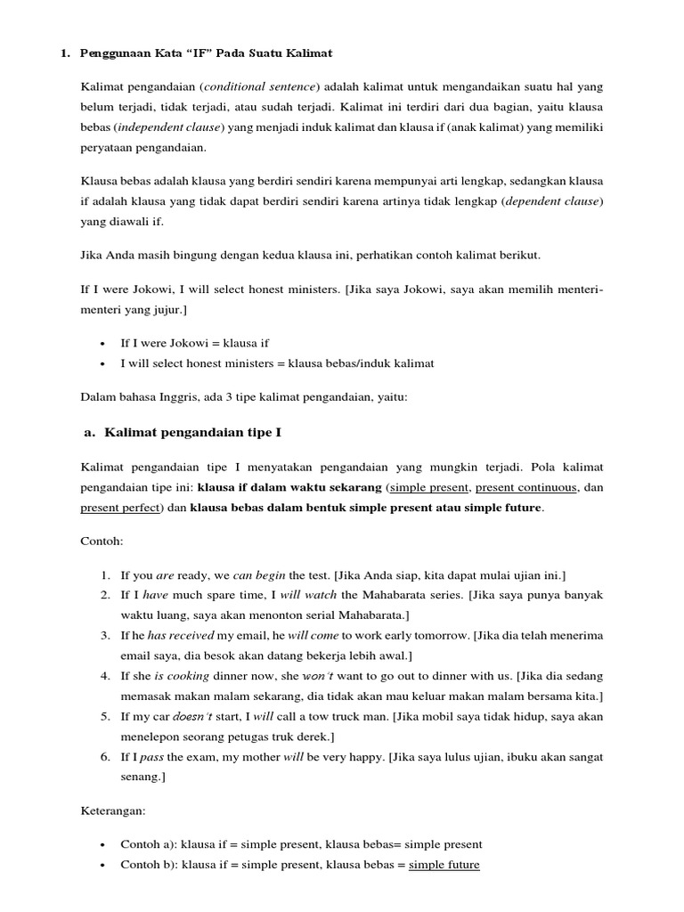 Jika aku bekerja keras aku akan memiliki banyak uang. Bila saya besar nanti saya ingin menjadi dokter. Sebenarnya pengertian kalimat aktif dan pasif dalam bahasa inggris sama saja dengan pengertiannya dalam bahasa indonesiaa. Kalimat pengandaian tipe i menyatakan pengandaian yang mungkin terjadi. Kami akan pergi jika kamu juga ikut ke sana. Conditional sentence merupakan suatu kalimat dalam bahasa inggris yang digunakan untuk mengungkapkan keinginan harapan pengandaian atau rencana yang mungkin dapat atau tidak dapat terwujud.
