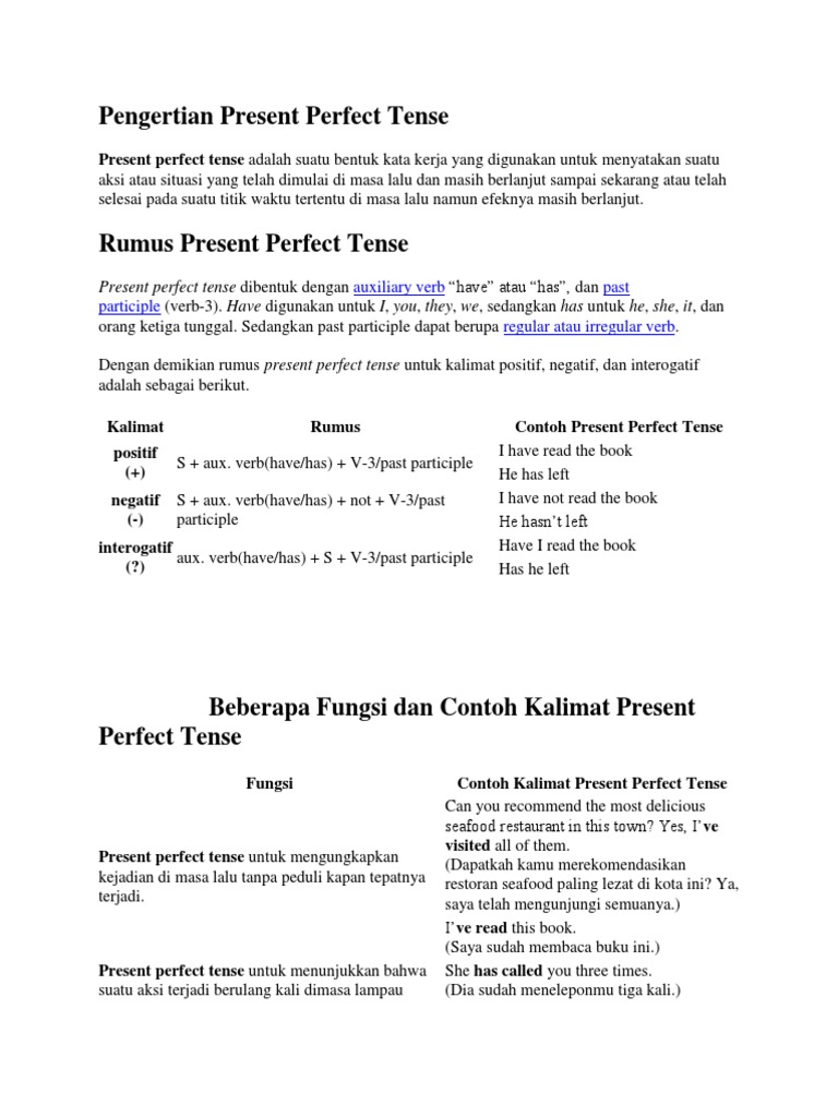 Mereka telah berjalan ke bioskop she has not hasnt wanted me coming here. Present perfect tense adalah suatu bentuk kata kerja yang digunakan untuk menyatakan suatu aksi atau situasi yang telah dimulai di masa lalu dan masih berlanjut sampai sekarang atau telah selesai pada suatu titik waktu tertentu di masa lalu namun efeknya masih berlanjut. Penjelasan contoh dan bentuk kalimat positif negatif introgatif dari 3 tenses yang umum digunakan bentuk kalimat positif negatif dan introgatif dari 3 tenses dalam kalimat bahasa inggris. Ketika kita mengobrol dengan teman sahabat pacar atau siapapun tentunya kita pernah membahas dan menceritakan suatu kejadian atau kegiatan yang sudah terjadi di masa lampau. Kuliah bahasa inggris contoh kalimat present perfect continuous tense dalam bahasa inggris dan arti selamat datang kembali sahabat kbi semua. Contoh kalimat present perfect continuous tense dalam bahasa inggris dan arti.