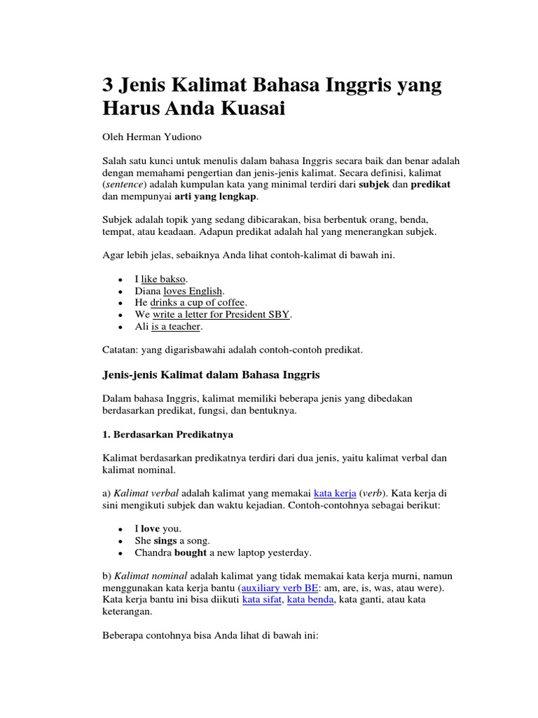 Terdapat dua kalimat yang menjadi dasar agar kita bisa membedakan suatu kalimat pada bahasa inggris yakni kalimat verbal dan nominal. Jenis kalimat verbal dalam bahasa inggris.