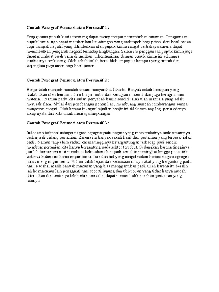 Contoh paragraf persuasi sudah pernah ditampilkan. Di mana beberapa diantaranya antara lain contoh kalimat dan paragraf argumentasi contoh paragraf argumentasi tentang iklan contoh paragraf argumentasi tentang kesehatan dan contoh paragraf argumentasi tentang rokokuntuk menambah khazanah contoh paragraf argumentasi artikel ini pun juga akan menampilkan contoh paragraf argumentasi. Juli 3 2020 september 18 2019 oleh guru pendidikan. Jenis karangan ini pastinya tidak asing lagi bagi anda yang terjun dalam dunia kepenulisan. Karena anyak sungai yang kotor akibat membuang sampah sembarangan dan pembuangan limbah rumah tangga yang tidak teratur pencemaran udara akibat asap kendaraan bermotor yang semakin banyak dan maraknya penebangan liar yang terjadi. Untuk pembahasan kali ini kami akan memberikan ulasan mengenai contoh karangan persuasi yang dimana dalam hal ini meliputi contoh tentang politik pendidikan advertensi propaganda sampah dan lingkungan hidup nah agar lebih dapat memahami dan mengerti simak ulasan selengkapnya dibawah ini.