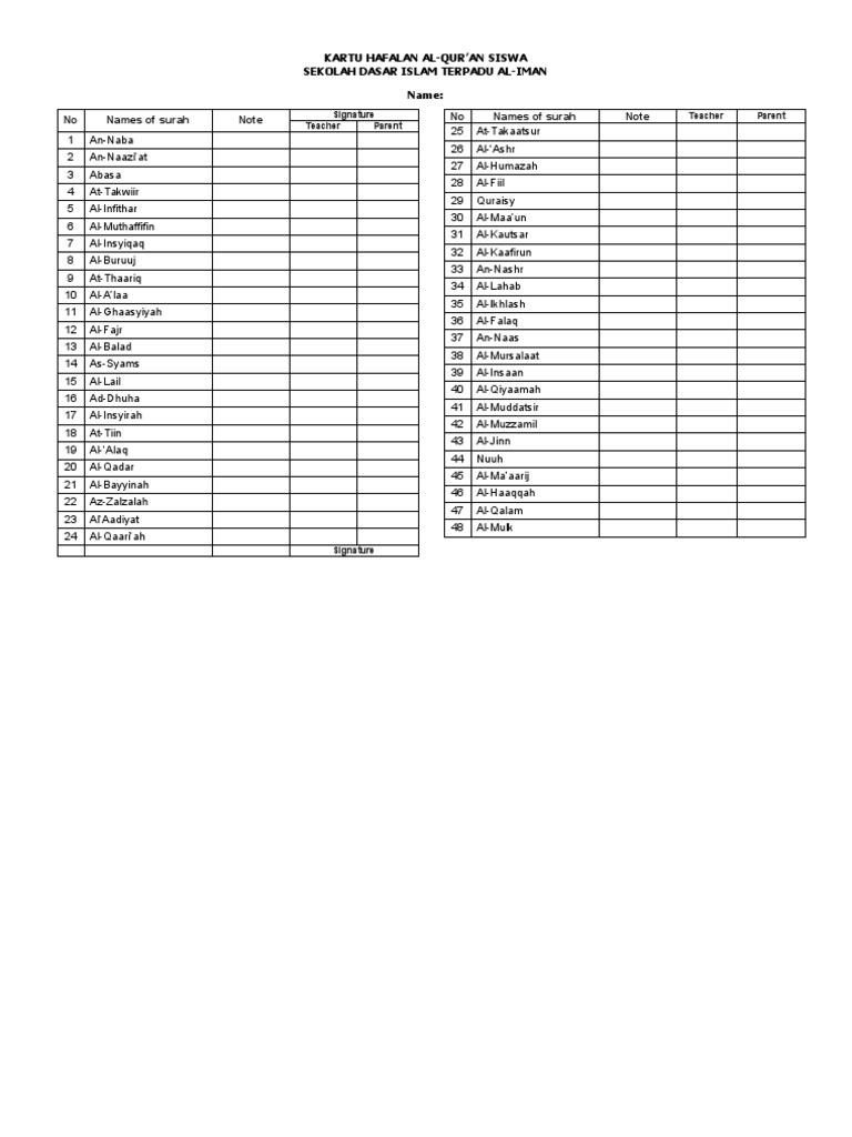 Contoh kartu setoran hafalan qur an. Daftar hafalan surat juz 30. Kali ini atas permintaan sekolah kehidupan al qomar saya menyusun kembali buku setoran hafalan al quran tersebut yang disesuaikan dengan program pendidikan di sekolah kehidupan al qomar kab. Alhamdulillah di luar dugaan buku setoran hafalan juz amma yang pernah saya buat mendapat banyak respon positif. Link download contoh cara menggunakan buku ini. Pada kartu kontrol hafalan al quran juz 29 ini kami membuat format yang sangat mudah di gunakan dan tidak memberatkan santri untuk setoran karena pada setiap surat kami membagi per 5 ayat untuk sekali setoran dan berjenjang. Apakah anda sedang mencari informasi contoh kartu setoran hafalan quran.