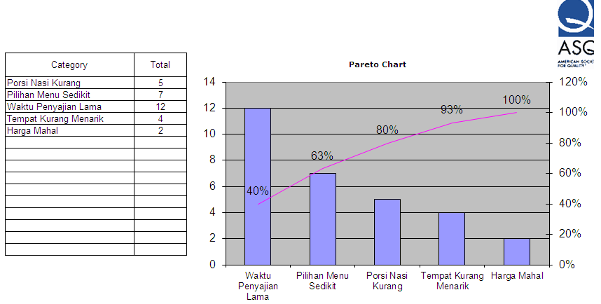 Diagram pareto merupakan langkah awal. Pada dasarnya diagram pareto adalah grafik batang yang menunjukkan masalah berdasarkan urutan banyaknya jumlah kejadian. Berikut tampak seharusnya dari analisis contoh ini. Hukum pareto menyatakan bahwa sebuah grup selalu memiliki persentase terkecil 20 yang bernilai atau memiliki dampak terbesar 80. Seperti contoh kasus dalam melakukan analisis terhadap kualitas rasa dalam proses produksi. Pengertian diagram pareto dan cara membuatnya diagram pareto merupakan salah satu tools alat dari qc 7 tools yang sering digunakan dalam hal pengendalian mutu.