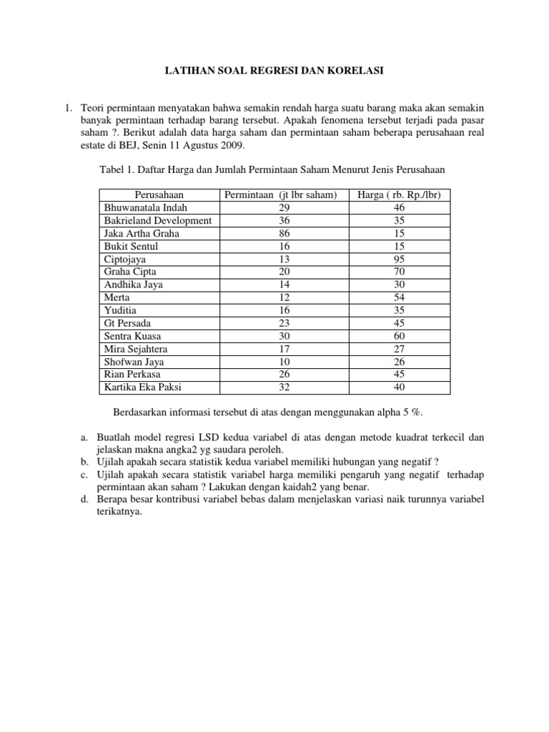 Contoh kasus korelasi dan regresi. Pengaruh harga dan pendapatan terhadap konsumsi produk x. Korelasi adalah salah satu teknik analisis dalam statistik yang digunakan untuk mencari hubungan antara dua variabel yang juga bersifat kuantitatif. Sebuah variabel hasil observasi yang diperoleh sangat mungkin dipengaruhi oleh variabel lainnya misalkan tinggi badan dan berat badan seseorang. Regresi linier sederhana adalah suatu metode yang digunakan untuk melihat bentuk hubungan antar satu variabel independent bebas dan mempunyai hubungan garis lurus dengan variabel dependennya terikat. Istilahregresi yang berarti ramalan atau taksiran pertama kali diperkenalkan oleh sir francis galton pada tahun 1877. Seorang mahasiswa meneliti apakah terdapat pengaruh harga dan pendapatan terhadap konsumsi produk x.