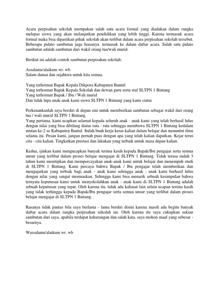 Contoh kata sambutan perpisahan. Pidato perpisahan dalam contoh kali ini terdiri dari teksnaskah pidato yang berisi kata kata perpisahan sekolah sd smp sma atau kelas 6 9 12 dan perpisahan dalam acara wisuda sarjana. Contoh kata sambutan sambutan pasti ada disetiap kita menghadiri suatu acara baik itu formal atau nonformal dalam suatu acara banyak sekali kata kata sambutan yang biasanya disampaikan oleh tokoh penting dalam suatu acara tersebut misalkan. Contoh pidato perpisahan guru. Teks sambutan adalah kumpulan kalimat atau kata kata yang disampaikan. Contoh kata sambutan kita tentunya sudah pernah menghadiri suatu acara baik itu formal atau nonformal nah dalam suatu acara tersebut banyak sekali kita lihat kata sambutan yang biasanya disampaikan oleh tokoh penting dalam suatu acara tersebut misalkan acara perpisahan sekolah biasanya akan ada kata sambutan dari kepala sekolah. Semoga contoh sambutan wali kelas dalam perpisahan kelas 6 diatas dapat sedikit bermanfaat bagi semuanya.