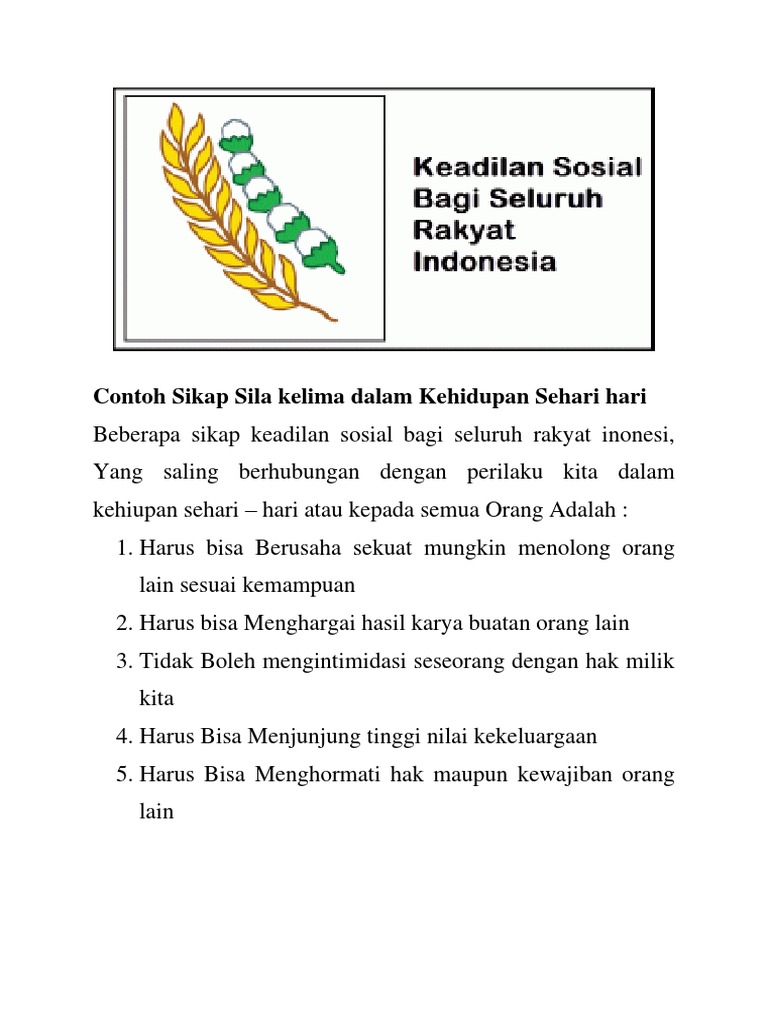 Contoh keadilan sosial bagi seluruh rakyat indonesia. C pandai membagi waktu untuk belajar bermain dan membantu orang tua. Sila kelima dari pancasila yang berbunyi keadilan sosial bagi seluruh rakyat indonesia merupakan cita cita luhur bangsa indonesia untuk menciptakan kesejahteraan bersama berdasarkan keadilan. Seluruh rakyat indonesia akan diperlakukan sama dan secara adil di hadapan hukum tidak memandang pangkat derajat pekerjaan tempat tinggal dan lain lain semua memiliki hak yang sama. Disamping itu yang patut diwaspadai adalah pengelompokan suku bangsa di indonesia yang kini semakin kuat. Kandungan isi dari sila sila dalam pancasila tersebut pada dasarnya telah menjadi bagian dari norma kehidupan bagi rakyat indonesia sejak dahulu kala. Dengan sila ke 5 keadilan sosial bagi seluruh rakyat indonesi manusia indonesia menyadari hak dan kewajiban yang sama untuk menciptakan keadilan sosial dalam kehidupan masyarakat indonesia.