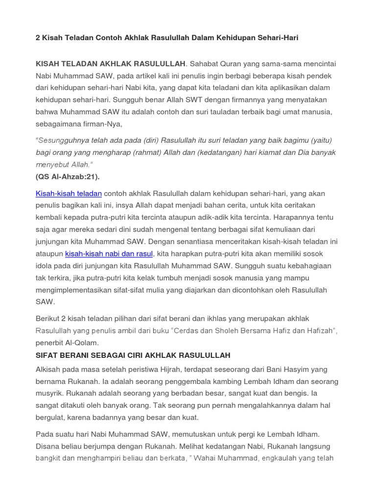 Sesungguhnya rasulullah sawadalah contoh teladan yang paling baik. Kisah teladan nabi muhammad saw rasulullah saw merupakan makhluk yang memiliki kasih sayang yang begitu tinggi terhadap umatnyadan kasih sayang itu pun tidak luput untuk kaum miskin para pembantu dan juga mantan budak. Contoh bukti kejujuran nabi muhammad saw ketika nabi muhammad saw. Banyak lagi contoh akhlak terpuji nabi muhammad saw yang patut dikaji diteladani dan disebarkan.
