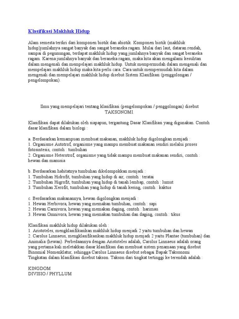 Perkembangan selanjutnya para ilmuwan telah mengembangkan cara pengelompokan makhluk hidup yang lebih baik dan lebih maju dibandingkan dengan cara cara pengelompokan pada zaman prasejarah. Terima kasih telah membaca artikel ini semoga bermanfaat dan jangan lupa untuk share artike ini ya. Dapatkan contoh soal mengenai bab klasifikasi makhluk hidup untuk tingkat smp dilengkapi dengan pembahasannya disini. Bab i pendahuluan 11 latar belakang dalam ekosistem terdapat salah satu komponennya yang berperan sebagai penyedia oksigenyang disebut juga dengan istilah produsen misalnya lumut yang dapat hidup di hampir semuatempat mulai dari kutub utara melintasi daerah tropis hingga daerah kutub selatan. Klasifikasi makhluk hidup pada postingan kali ini saya ingin membagi atau menshare contoh soal ulangan harian ipa klasifikasi makhluk hidup mungkin ini akan sedikit membantu tugas para guru untuk mengukur kemampuan anak didiknya terlebih dalam memahami materi ipa untuk tigkat smp yaitu tentang bab klasifikasi makhluk hidup. Contoh dasar klasifikasi dalam biologi.