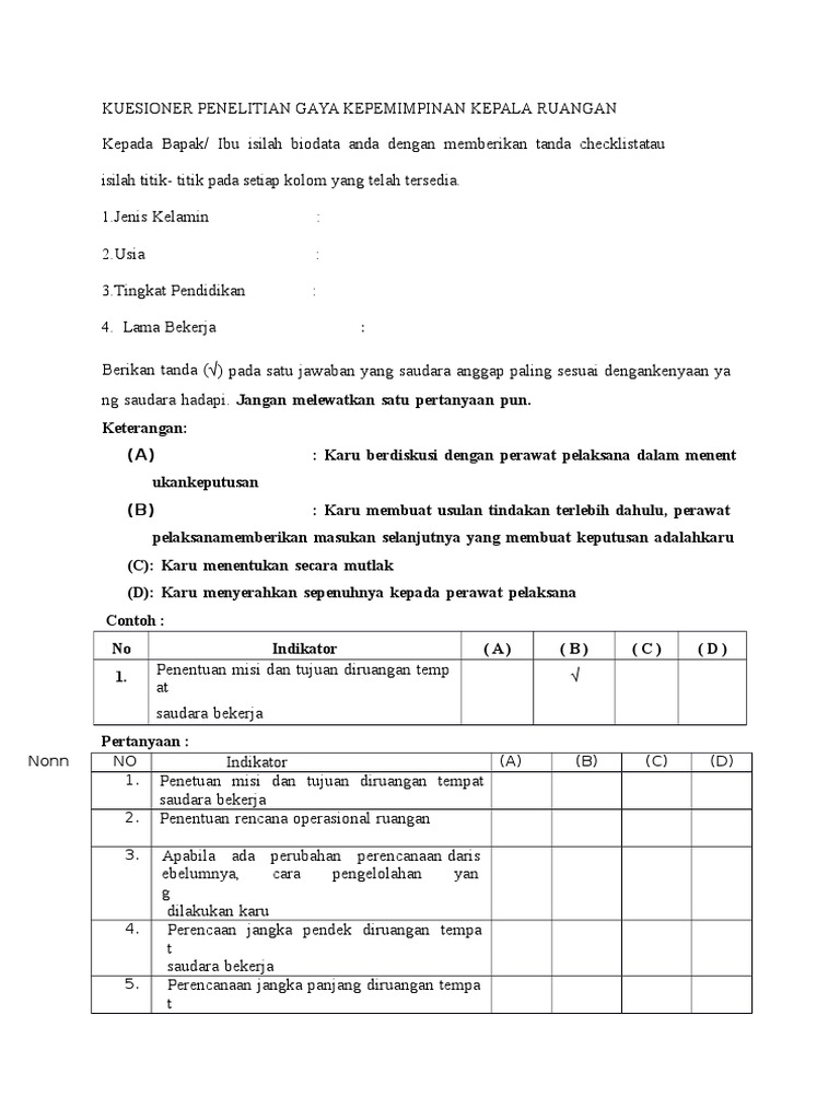 Kuesioner pengaruh gaya kepemimpinan dan kompensasi terhadap kinerja karyawan pada perusahaan konveksi cipta karsa anugerah pati pengantar demi tercapainya penelitian ini maka penyusun mohon kesediaan dari bapakibusaudara untuk membantu mengisi angket atau daftar pertanyaan yang telah disediakan. Kuesioner budaya organisasi views hasil ujicoba kuesioner burnout views hasil ujicoba kuesioner. Referensi daftar pertanyaan kuesioner tentang pengaruh gaya kepemimpinan terhadap kinerja pegawai pt pln distribusi jawa barat dan banten jl. Kuesioner ini merupakan kuesioner yang penulis susun dalam rangka pelaksanaan penelitian. Kuesioner gaya kepemimpinan model hersey blanchard. Al ijarah indonesia finance lampung skripsi diajukan untuk melengkapi tugas tugas dan memenuhi syarat syarat guna memperoleh gelar sarjana s1 dalam ilmu dakwah.