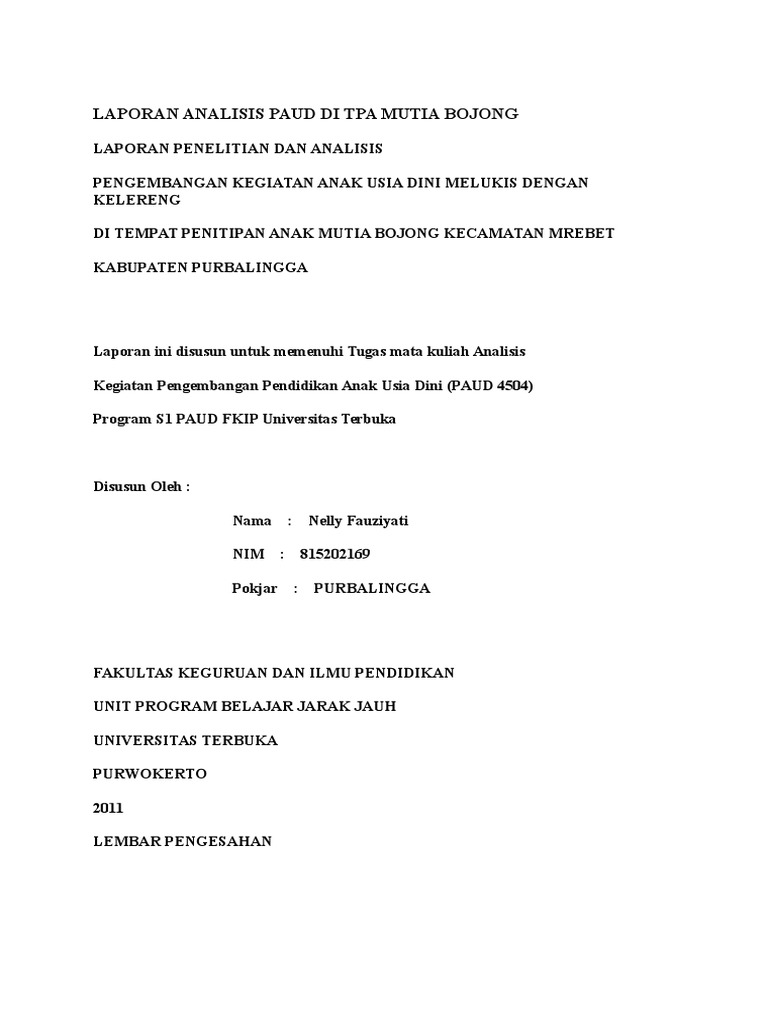 Contoh laporan analisis di tpa. Laporan ini disusun untuk diajukan memenuhi tugas mata kuliah analisis kegiatan pengembangan pendidikan anak usia dini pada program strata 1 pendidikan guru pendidikan anak usia dini di fakultas keguruan dan ilmu pendidikan universitas terbuka. Di tempat penitipan anak mutia bojong kecamatan mrebet. Laporan analisis pada tpa. Di mana diperlukan menyarankan tindakan perbaikan yang sesuai dan hemat biaya 2. Disetujui sebagai laporan dan analisis mata kuliah analisis kegiatan pengembangan pendidikan anak usia dini. Laporan analisis paud di tpa mutia bojong laporan penelitian dan analisis.