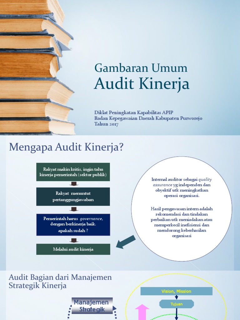 Tim auditor membuat laporan audit 5. Penutupan kegiatan audit 1. Penyusunan laporan keuangan bagi masyarakat dan analisa oleh para kreditor. Penilaian capaian kinerja dengan membandingkan data capaian kinerja terhadap key performance indicator kpi. Penilaian capaian kinerja dilakukan berdasarkan kriteria yang sudah ditetapkan dalam program kerja audit. Bantuan teknis dan pelatihan yang diberikan melalui komponen perencanaan penganggaran dan pelaporan terpadu.